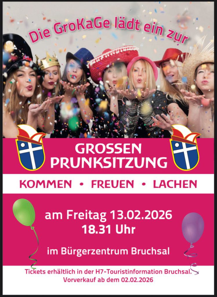 Anmeldung (für die Große Prunksitzung) unter: anmeldung@grokagebruchsal.de